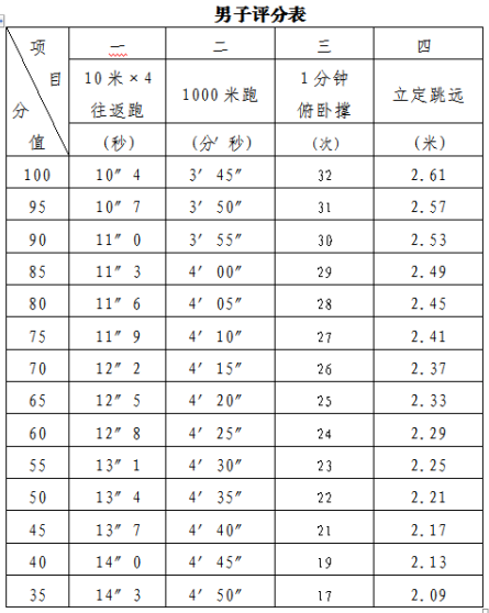 男生项目一:10米X4往返跑。项目二:1000米。项目三:俯卧撑。项目四:立定跳远。