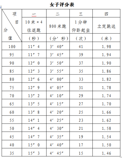 女生项目一:10米X4往返跑。项目二:800米。项目三:仰卧起坐。项目四:立定跳远。